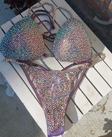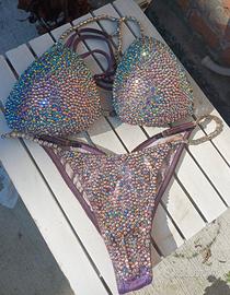 Vendo bikini per Model/bikini Costume da gara bikini lilla e argento riflettenti, con giunture tra le coppe e negli slip Taglia pezzo superiore 2/4 Slip regolabile con gancetti all'interno. Usato tre volte (presente sacchetto con strass di ricambio)