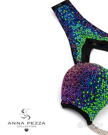 Costume realizzato su misura con coppe reggiseno completamente tempestate da una cascata centrale di cristalli azzurri e verde fluo che sfumano in cristalli blu e viola π
