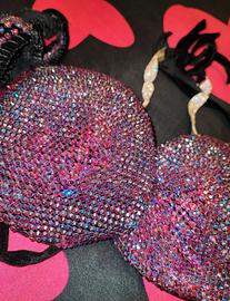 Bikini da gara bodybuilding full strass Preciosa colore Rosso aurora boreale. In base alla luce cambia la tonalità dal rosso al lilla all'azzurrino. Brilla tantissimo!