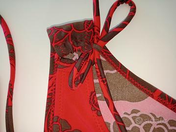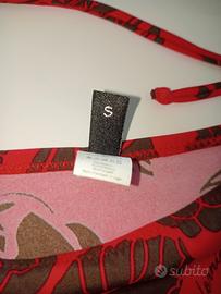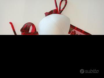 Bikini Madonna, taglia S, fantasia floreale nera su base rossa. Reggiseno a triangolo con imbottitura estraibile e slip con laccetti regolabili. Indossato pochissimo. In perfette condizioni.