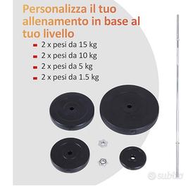 VENDO HOMCOM Bilanciere Olimpico 70kg 8 Pesi Regolabili sbarra di ferro superficie zigrinata per Palestra, casa Tubo di ferro, PVC, Sabbia 170L x40.5P x40.5 A cm Nero SET BILANCIERI DA 70 KG QUESTO SET DA 70 KG INCLUDE 2 PESI DA 15 KG, 2 DA 10 KG, 2 DA 5 KG, 2 DA 1,5 KG DI PESO, UNA SBARRA E DUE CLIP DI BLOCCAGGIO. ALLENAMENTO PER TUTTO IL CORPO: ALLENATI CON QUESTO PRATICO BILANCIERE, PERFETTO PER IL TRAINING E L'ESERCIZIO DI BRACCIA, COSCE, VITA, GLUTEI E DELLA PARTE CENTRALE. SICUREZZA: È DOTATO DI 2 CLIP DI BLOCCO PER ASSICURARE CHE LE PIASTRE DEI PESI NON SCIVOLINO O RUOTINO DURANTE L'USO, PREVENENDO LESIONI DURANTE IL FITNESS E AUMENTANDO LA SICUREZZA. DURABILITÀ: LA BARRA FILETTATA IN 3 PEZZI DA 25 MM DI DIAMETRO E LUNGA 170 CM È COSTITUITA DA UN TUBO DI FERRO PESANTE, REALIZZATO PER UN USO PROLUNGATO NEL TEMPO. DIMENSIONE: DIMENSIONI COMPLESSIVE: 170L X 40.5P X 40.5A CM, PESO TOTALE: 70 KG IN OTTIME CONDIZIONI.