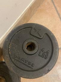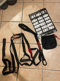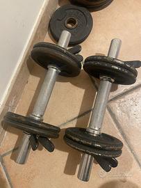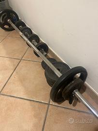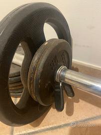 Vendo set cosi completo 1 bilanciere 2 manubri 4 fermi 14 dischi in ghisa da 1 kg 6 dischi in ghisa da 2kg 2 dischi in gomma da 5 kg 1 TRX completo di sacca e scheda per esercizi
