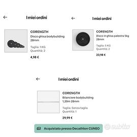 Vendo bilanciere e dischi decathlon per causa inutilizzo. È tutto in ottimo stato! Il pacchetto comprende: 1 bilanciere più relative chiusure 6 dischi in ghisa da 1 kg 2 dischi in ghisa da 5 kg Lascio qua sotto un conto del prezzo pagato nuovo: Bilanciere (6 kg) = 29,99 € Disco 1 kg = 2,49 x 6 PZ = 14,94 € Disco 5 kg = 11,99 x 2 PZ = 23.98 € Totale = 68.91 €