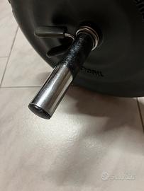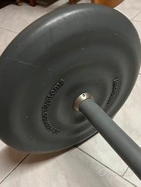 Kit per palestra, composto da bilanciere e 2 dischi in plastica riempibili a piacere con acqua o sabbia. Bilanciere in acciaio con rivestimento in gomma, lunghezza cm 130, diametro cm. 3, e peso circa Kg. 1,7. 2 dischi in plastica 3B Fitness System Trebipush, cm 33 di diametro, spessore cm. 5., riempibili. 2 ganci a molla per fissaggio dei dischi. Usato poco, in ottime condizioni.