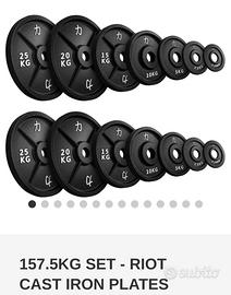 Vendo set di dischi cast iron Strengthshop 157.5KG e bilanciere 2029 power bar total black, condizioni ottime per tutti gli oggetti.