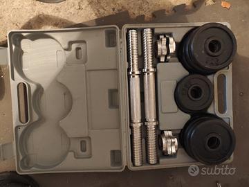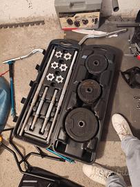 Bilanciere + due manubri + 4 dischi da 5 kg +8 dischi da 2 kg + 4 dischi da 0.5 kg