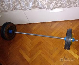 Bilanciere per panca pettorali o bicipiti tricipiti spalle squat con pesi rimuovibili in acciaio (non fusi in ghisa) su doppia barra acciaio diametro foro pesi 25/28mm .Corredati di bloccapesi .