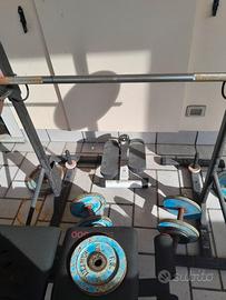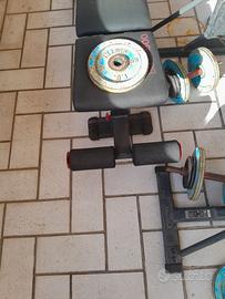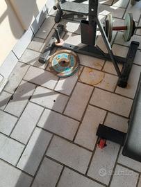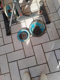 Bilanciere + Pesi (20-10-5) TOTALE (8+90) Kg. 98 Panca regolabile quasi nuova 2 ritti quasi nuovi Attrezzo per STEP Bilanciere per curling 20 Kg.