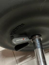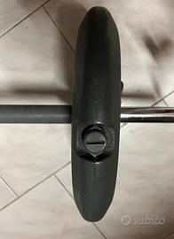 Kit per palestra, composto da bilanciere e 2 dischi in plastica riempibili a piacere con acqua o sabbia. Bilanciere in acciaio con rivestimento in gomma, lunghezza cm 130, diametro cm. 3, e peso circa Kg. 1,7. 2 dischi in plastica 3B Fitness System Trebipush, cm 33 di diametro, spessore cm. 5., riempibili. 2 ganci a molla per fissaggio dei dischi. Usato poco, in ottime condizioni.
