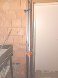 -Pali bilancione in acciaio inox, diametro 5,5 cm, 3 sezioni da 2 MT ciascuno, dotati di pulsante a molla per facile innesto. Attrezzati con occhielli passanti e bitta per legatura tiranti. La prima sezione equipaggiata con foro per alloggiamento piede, la terza con foro per alloggiamento carrucola.
