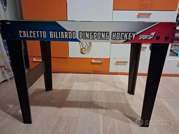 il biliardo si scompone permettendo più giochi: hockey, biliardo, biliardino, ping-pong. accessori compresi.