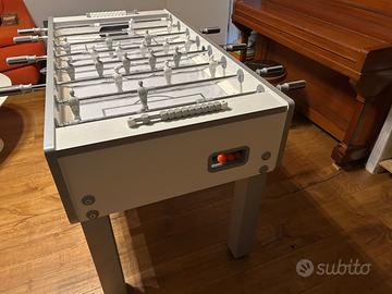 Biliardino da bar in legno bianco, robusto e dal design elegante, con gambe in metallo. Si abbina anche al soggiorno di una casa moderna.