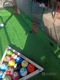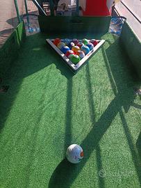 composto da 3 pannelli di base, 6 pannelli sponde laterali , completo di tappeto verde, 15 palle numerate più la bianca, 1 triangolo, rete di recinzione da un lato, con possibilità di aggiungere recinzione su entrambe i lati, lasciando un apertura per l ingresso.