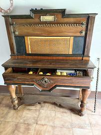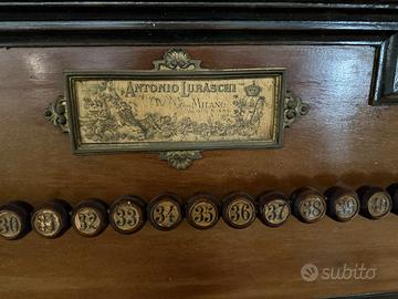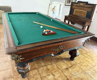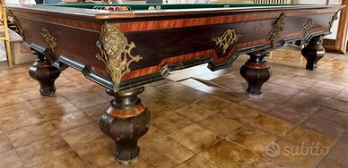 Il biliardo deve essere smontato e ritirato entro fine maggio. Smontaggio e trasporto a carico dell’acquirente. Se necessario, posso fornire contatti di professionisti per preventivi su smontaggio, trasporto e restauro, così da facilitare l’organizzazione. Biliardo originale Antonio Luraschi, fine ‘800 / primi ‘900, realizzato in palissandro con intarsi in bois de rose, per gioco all’italiana (boccetta), con sei buche strette e piano in tre lastre di ardesia spessore circa 25 mm. Si tratta di un grande biliardo da sala di produzione italiana storica, raro da trovare. Completo di mobile segnapunti originale abbinato. Corredato di accessori di gioco, tra cui biglie e stecche. Campo di gioco di tipo standard e dimensioni complessive del biliardo di circa 320 x 180 cm. Buche cesellate in bronzo. Condizioni: Presenza di tracce di tarlo (da trattare). Panno da sostituire. Biliardo situato a Spello (PG), Umbria. ------- The billiard table must be dismantled and collected by the end of May. Disassembly and transport at the buyer’s expense. If needed, I can provide contacts of professionals for quotes on dismantling, transport, and restoration, to help facilitate the organization. Original antique Antonio Luraschi billiard table, late 19th / early 20th century, made of rosewood with bois de rose inlays, designed for Italian-style play (boccetta), with six narrow pockets and a playing surface in three slate sections, approximately 25 mm thick. This is a large historical Italian billiard table, rare to find. Complete with original matching scoreboard cabinet. Supplied with playing accessories, including balls and cues. Standard playing field with overall dimensions of approximately 320 x 180 cm. Pockets finely crafted in bronze. Condition: Presence of woodworm traces (requires treatment). Cloth needs to be replaced. The billiard table is located in Spello (Perugia), Umbria, Italy.