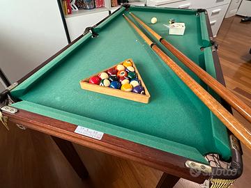 Biliardo mini in legno, misure 127x67 altezza 74, altezza piedini regolabile compreso di 2 stecche , set di 16 palline , set di 3 palline con birilli e gessetto nuovo..