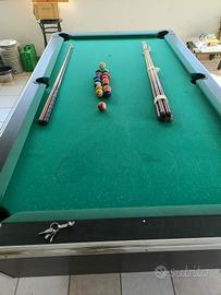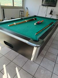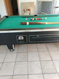 Vendo tavolo da biliardo commerciale o per usò domestico, al momento si trova in un bar, non abbiamo più spazio, è in buone condizioni, il materiale verde deve solo essere cambiato, mancano il triangolo e una palla nera, molto stabile e con fiches a noleggio!!!