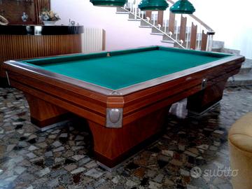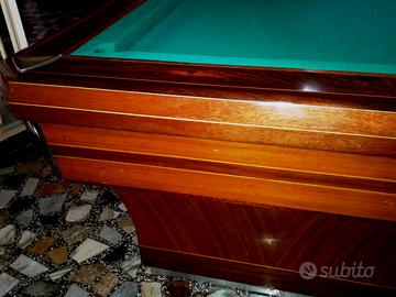 Il Biliardo a sei buche, ricordo di mio padre, si trova in una casa in vendita che non potrà più ospitarlo. Le parti in legno, sia i rivestimenti che le parti strutturali, gli accessori ed il tappeto sono in buone condizioni come si può vedere dalla foto. Le dimensioni del tappeto sono 2,70x1,35 mt., le dimensioni esterne sono 3,05x1,75 mt. ed è completo di rastrelliera con 11 stecche normali, rastrello, stecca corta, stecca lunga, segnapunti, cassetto portaoggetti, birilli, palle da boccetta numerate con triangolo, palle all'italiana, telo in stoffa di copertura e kit illuminazione con tre plafoniere a neon (neon non compresi).