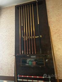 Biliardo italiano come non se ne trovano piu adesso. Tenuto benissimo, venduto con tutta la parete delle aste e il contapunti (manuale ed elettronico), i birillini, le palline e il telo per coprire il tavolo. Il biliardo ha il tappeto riscaldabile. Modello e qualità ottima di una volta.