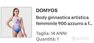 Vendo body per ginnastica artistica acquistato da Decathlon marca Domyos, taglia 14 anni. Poco utilizzato e in ottime condizioni come foto. Per chi fosse interessato dispongo anche di un top sportivo taglia S utilizzato una sola volta poiché troppo stretto, colore bianco, sempre del Decathlon (posso inviare foto, prezzo top 3€). Ritiro a mano in Torino nord o spedizione con tuttosubito.