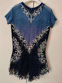Vendo body per gare della ginnastica ritmica, velluto blu scuro, retina blu con pietre Swarovski di varie colori e grandezza, manica corta , girocollo, gonnellino doppio, mutandine con elastico.