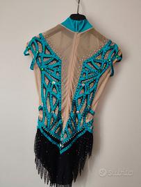 Body da ginnastica ritmica, taglia S. Realizzato con tessuto color carne trasparente e inserti in tessuto turchese.