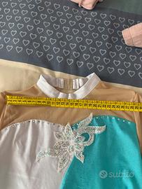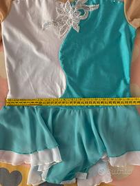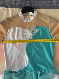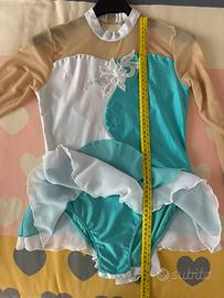 Body per pattinaggio, no sartoria, tessuto elastico e rete con applicazione a fiore. Taglia circa 8/9 anni. Usato 1 volta, piccolo difetto come da foto. Buono come primo body di prova