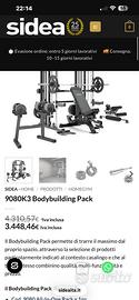 Acquistata 3 mesi fa la vendo per cambio progetto. 2900 euro Il Bodybuilding Pack permette di trarre il massimo dal proprio spazio, attraverso la selezione di prodotti particolarmente indicati al contesto casalingo e che al tempo stesso combinino qualità, multi-funzionalità e prezzo. il Bodybuilding Pack comprende: Cod. 9080 All-In-One Rack x 1pz. Cod 9080/3 All-In-One Knee Holder x1 pz. Cod. 9080/6 All-In-One Leg Extension x1 pz. Cod. 9016/1Lock Collar – Coppia collari Ø 50 mm x 1 cp. Cod. 9015/8 Bilanciere Olimpico Training x 1 pz. Cod. 9030/3 Rubber Plates 1,25 Kg Black x4 pz. Cod. 9031/3 Rubber Plates 2,5 Kg Black x4 pz. Cod. 9032/3 Rubber Plates 5 Kg Black x4 pz. Cod. 9033/3 Rubber Plates 10 Kg Black x4 pz. Cod. 9035/3 Rubber Plates 20 Kg Black x2 pz. Cod. 8900 Rack for Adjustable dumbbell x 1 pz. Cod. 8900/32 Adjustable dumbbell 2-32 Kg x 1 cp. Cod. 9025 Adjustable Pro bench x 1 pz.