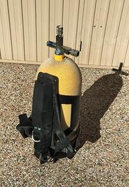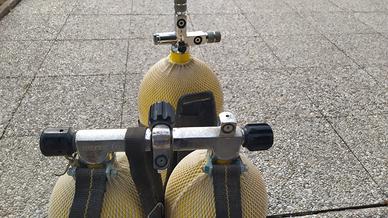 Bombole come da foto, DA COLLAUDARE, inutilizzate da almeno 6 anni, con retino di protezione. Bombola singola: 15L, due manopole, con schienale. Bombola doppia: 20L, con cinghie come da foto, rubinetteria da sostituire (funziona solo la manopola centrale, le altre stanno chiuse). 50€ la singola, 80€ la doppia, 110€ in blocco