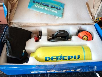 bombolino sub da un litro usato poco, confezione come da foto. in ottimo stato con valvola per ricarica due boccagli di scorta zaino di supporto per immersione