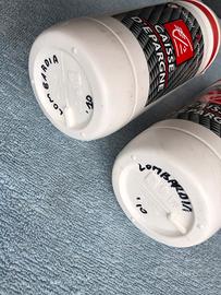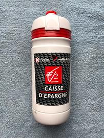Coppia di borracce Elite e di cui una di particolare interesse modificata in porta utensili dal team Caisse D’Epargne e usate in gara al Giro di Lombardia 2010. Race kit/race tips. Segni da uso come da foto.