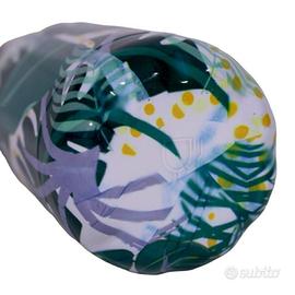 Borraccia bottiglia verde in alluminio metallizzato, lucida, sfondo verde e decorazioni stilizzate floreali, adatta per liquidi sia caldi che freddi. Con tappo di sicurezza.