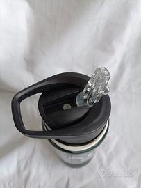 Borraccia di plastica color grigio con tappo nero, della Garmin, con beccuccio.