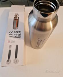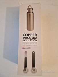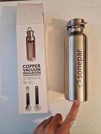 Borraccia termica con isolamento sottovuoto in rame. Struttura sottovuoto a doppia parete in acciaio inossidabile con isolamento in rame. Mantiene le bevande fredde fino a 48 ore, calde fino a 12 ore. Previene la formazione di condensa all'esterno. Con scritta "Sonepar" sul lato. Gadget mai utilizzato, regalo non voluto.