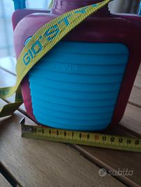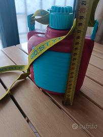 Borraccia GioStyle in plastica perfetta per le tue attività all'aperto. È in ottime condizioni ed è di colore rosa e turchese. Include una tracolla verde. Tappo a vite.