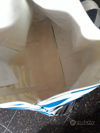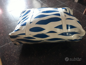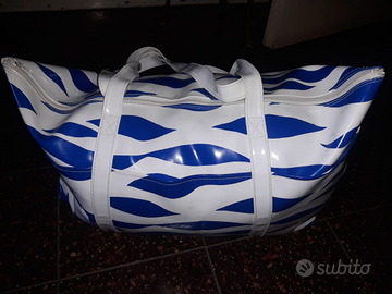 Vendo borsa da mare colore blu e bianco in plastica ..ha tre(3) tasche esterne e una (1)tasca interna...lunghezza 0,58 cm ..altezza 0,43 cm ...lunghezza maniche 0,32 cm ...in buone condizioni...