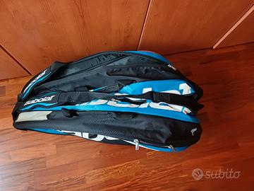 Borsa da tennis marca Babolat Team composta da 4 capienti scomparti per racchette, abbigliamento ed accessori il tutto a chiusura con cerniera manico oer trasporto a mano e doppia tracolla nuova anche se priva di cartellino colore azzurro nero e bianco
