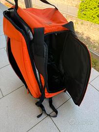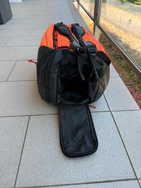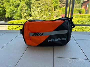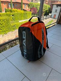 Borsa da tennis Head, in ottimo stato, usata poco, colore arancione, nero e grigio, tasca centrale capiente , tasca laterale per rachetta, tasca laterale per acessori e tasca sul fondo per scarpe. È possibile portarla a mano o in spalla.