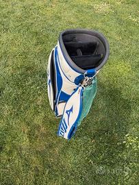 Vendo splendida borsa da golf Mizuno Tour Cart Bag in colorazione bianco/blu, incredibile pezzo vintage La borsa è dotata di top a 5 divisori, tasche ampie con cerniere perfettamente funzionanti, struttura rigida in pelle/ecopelle. Completa di rain hood. Le condizioni generali sono molto buone: la borsa si presenta bene, con normali lievi segni duso compatibili con lutilizzo, ma senza evidenti graffi o deterioramenti importanti della pelle/ecopelle.