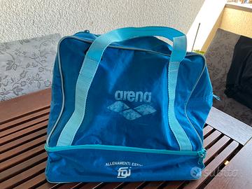 Borsa palestra/ sport Arena in buono stato, in tessuto nylon azzurro con vano portascarpe cm. 35x34x26 peso gr, 300