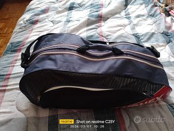 Borsa portaracchette Yonex blu con inserti rossi e grigio scuro. Due scomparti separati più tasca laterale e sacca porta scarpe. Cerniere tutte funzionanti, nessun buco o strappo. Leggera e capiente senza essere ingombrante. 1 tracolla regolabile, leggero difetto il logo sulla tracolla è scolorito come da foto