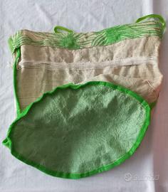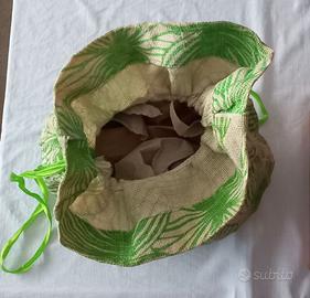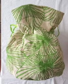Borsa Sacco Contenitore, in fibra resistente, colori tenui, con chiusura a laccio a cm 23. Il fondo verde ovale è idrorepellente. Il sacco contenitore, è utilissimo per riporre accessori per la toilette o altro. Dimensioni: Fondo cm 31 x 21. Altezza totale cm 32. Il riccio a cm 23. Ottima per il mare e piscina.