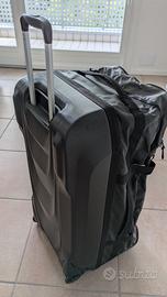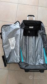 Scocca inferiore in plastica rigida resistente con grandi ruote robuste e pratica maniglia in alluminio estraibile, come un trolley. Ideale per vacanze, per portare l'abbigliamento e l'attrezzatura bagnata. La borsa è impermeabile e gli scomparti permettono di separare la roba che deve rimanere asciutta da quella bagnata.