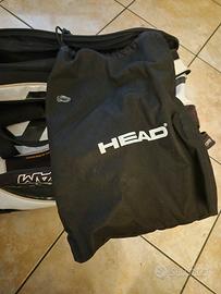 Buongiorno, vendo borsone da tennis Head Tour Team Novak Djokovic diviso in 3 tasche: 1 tasca laterale con rivestimento isotermico ( rovinato parzialmente) dove si possono mettere fino a 3 telai con rispettive foderine in tela; un'altra tasca più ampia dove mettere i vestiti o altro con un sacchetto separato per le scarpe; infine un'altro reparto organizzato ,organizzato con piccole tasche dove mettere i documenti o il cellulare , i grip di riserva, un tubo di palline ecc.