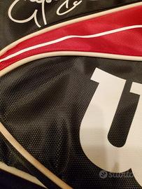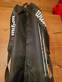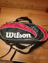 Borsa per racchette da tennis Wilson Federer Team 3 Pack, ideale per trasportare fino a tre racchette insieme agli accessori essenziali. Con 2 tasche laterali con zip e spallacci regolabili per usarla a zaino. Ottimo stato come da foto. Usata pochissimo. Dimensioni, 78 x 36 , larghezza aperta circa 30 cm.