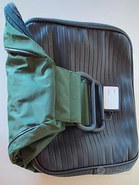 Borsa zaino tecnica di design della stilista Roberta di Camerino, in tessuto sintetico (nylon tecnico) verde scuro, con profili e scomparto in plastica resistente blu. Pieghevole.