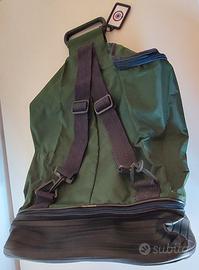 Il fondo, apribile, forma un ampio scomparto separato dove inserire le scarpe. Molto capiente, diventa un grande zaino. Tasca frontale con zip, etichetta per nome e indirizzo profilata in gomma.