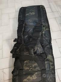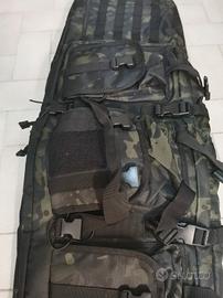 Borsa con bretelle stile zaino o custodia doppia per portare due fucili o più separatamente, con varie tasche e imbottitura per proteggere al meglio quallo che si ha all'interno, misure 110 lunchezza, altezza circa 8 centimetri ma va di più in base a cosa si mette, larghezza 30 cm.