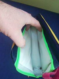 Bella imbottitura,con agganci per fissarla ai tubolari della bicicletta con cerniera e maniglia per il trasporto