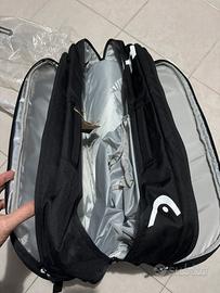 Borsa Head Tour Padel Bag L I suoi 3 scomparti sono stati progettati per riporre le racchette e l'attrezzatura sportiva. Questa borsa ha anche una tasca per tenere le scarpe separate dal resto dei vostri effetti personali. È dotata di una tasca termica per mantenere fresche 2 racchette o la bottiglia d'acqua.Questa borsa Head Padel può essere trasportata come uno zaino o a tracolla grazie alle due tracolle imbottite e regolabili. È inoltre dotata di una doppia maniglia sulla parte superiore per poter essere trasportata a mano.