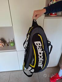 Borsone da tennis usato ma in buone condizioni. Ha due scomparti per contenere fino a 6 telai e uno dei due con il rivestimento termico . Nelle 2 tasche laterali si possono tenere in ordinegli accessori. Materiale esterno resistente e impermeabile .